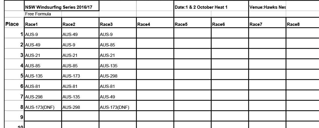 Windsurfing Heat 1 2016/17 FW Results