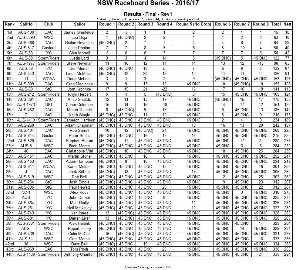 2016/17 NSW Raceboard Series Final Results