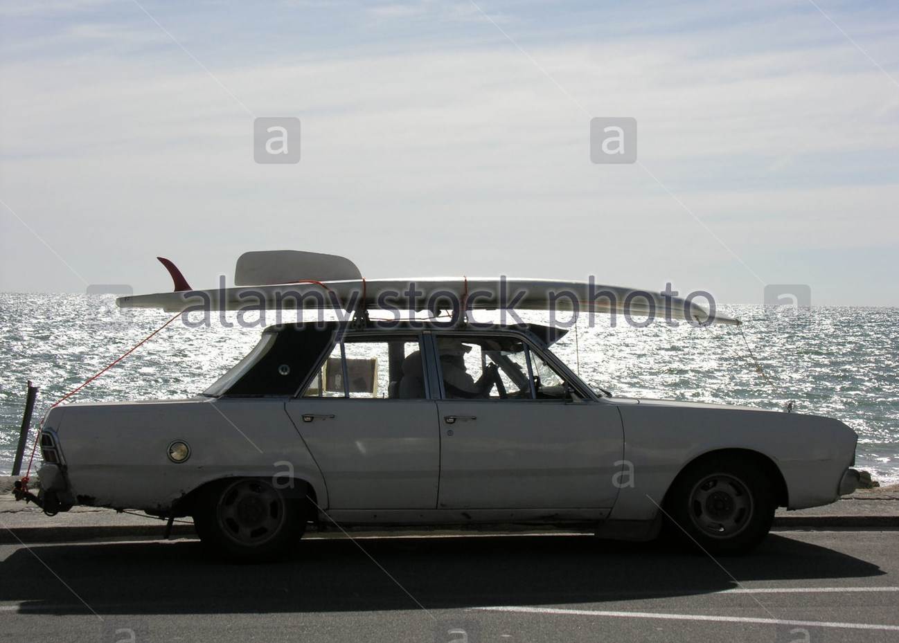 old-convertible-car-with-surfboard-on-roof-driving-on-esplanade-A5HM6E