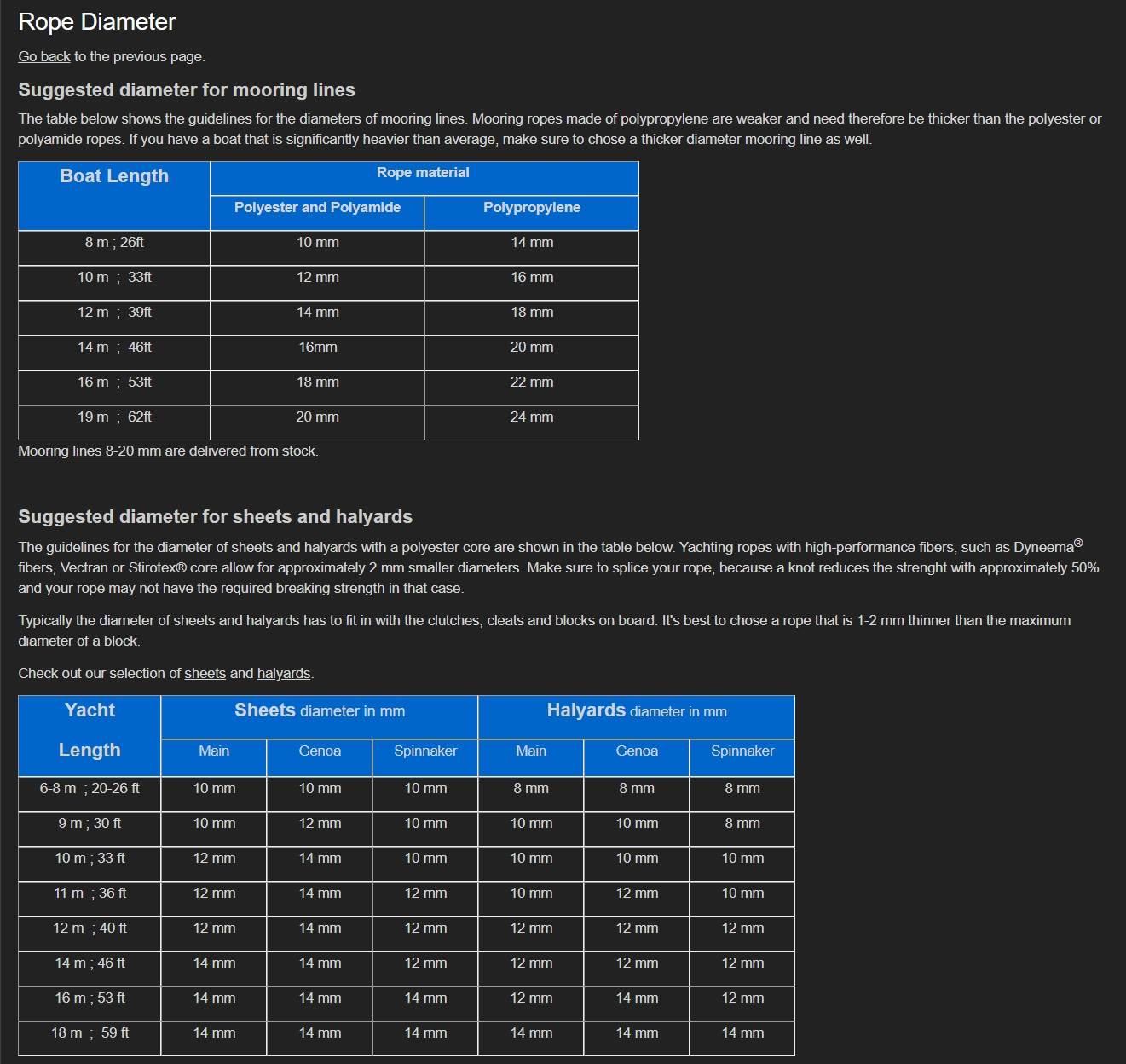 Sailing rope sizing