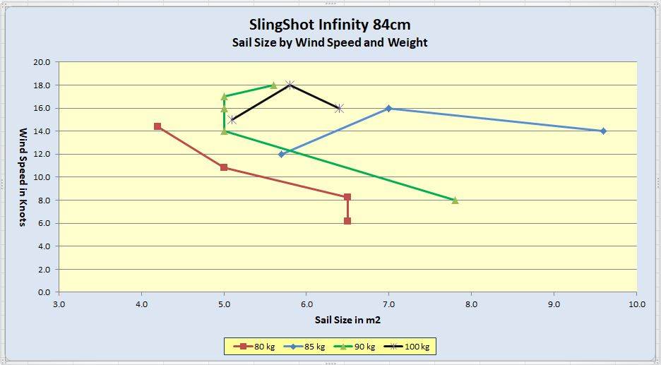 Infinity 84cm, sail size by windspeed and sailor weight