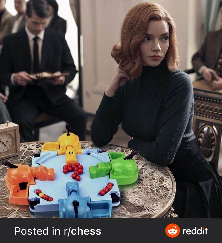Beth Harmon gambits the orange hippo