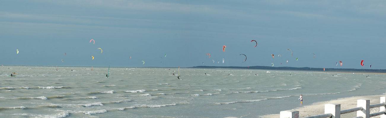 Kiteboarding crowded beach in france