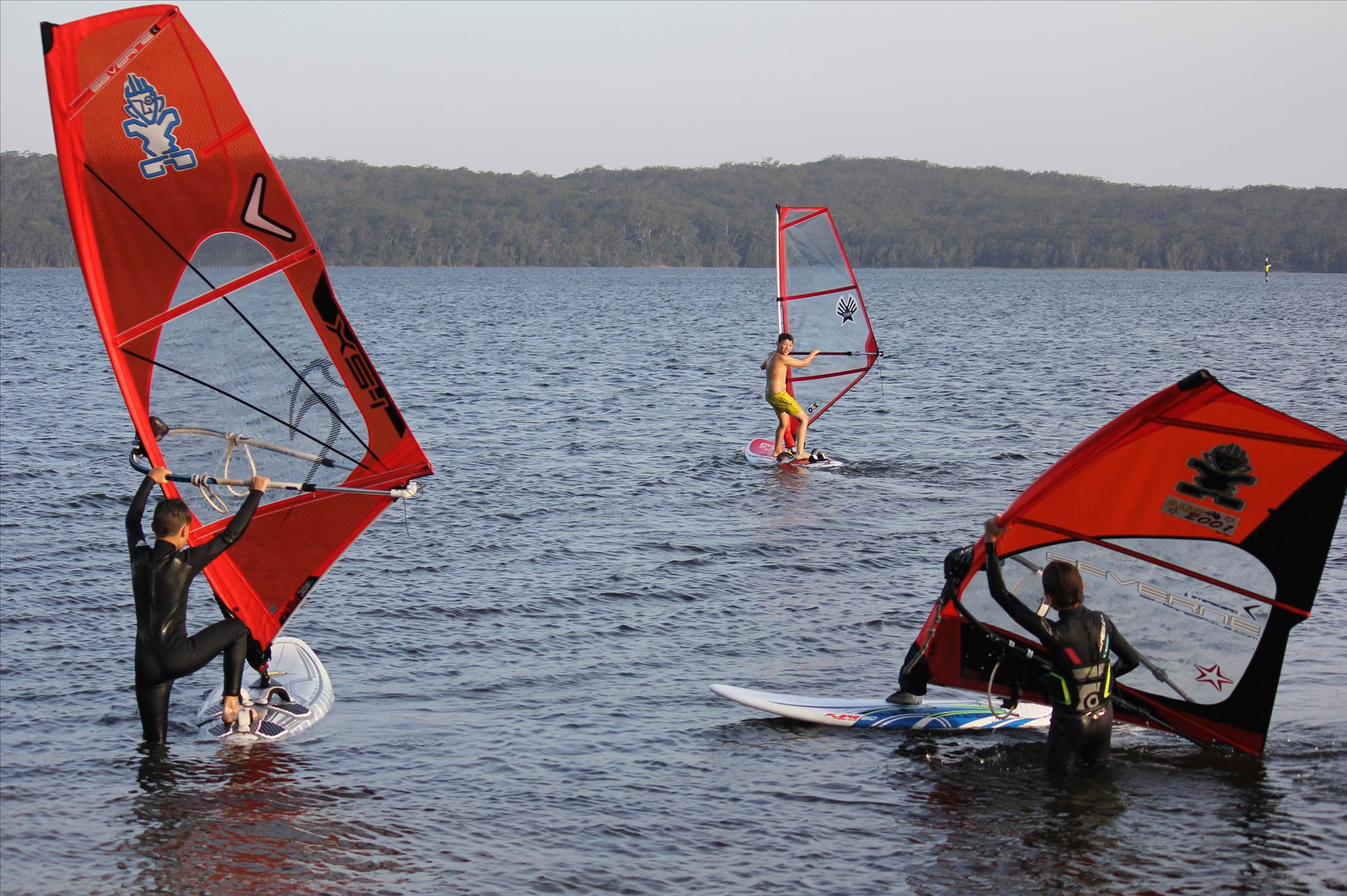 Kid teaching his friends to windsurf